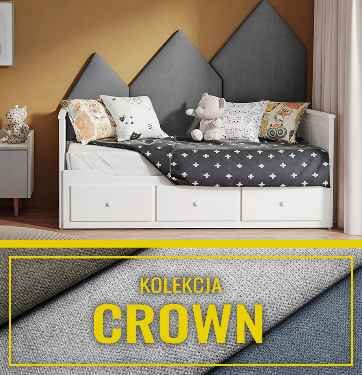 • Tkanina CROWN: Popularna welurowa tkanina tapicerska (obiciowa, meblowa), grubo pleciona. Powierzchnia z lekkim połyskiem o wyjątkowym splocie. Jej cechą charakterystyczną jest ciekawa struktura i głębokie nasycenie koloru. Cieszy się popularnością ze względu na wysoką wytrzymałość, odporność na peeling i rozdarcia. Tkanina posiada innowacyjną apreturę ochrony włókien tkanin - STAIN PROTECTION, dzięki której wszelkie zabrudzenia możemy usunąć za pomocą kilku prostych kroków, a co najważniejsze nie naruszając przy tym struktury materiału.