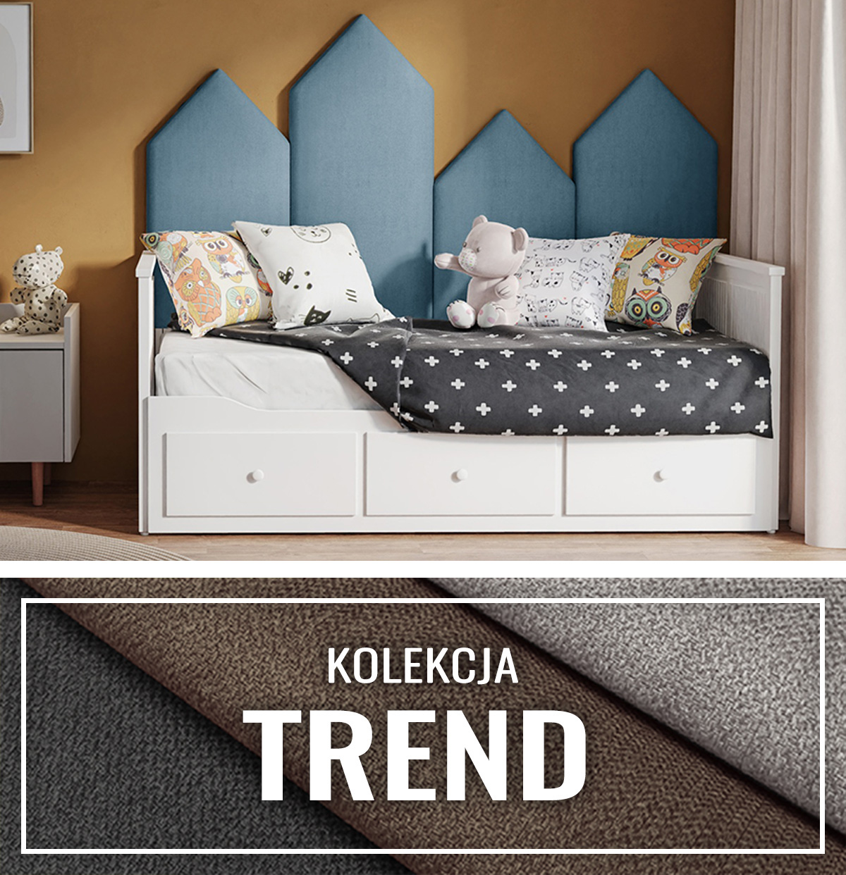 • Tkanina TREND: Tkanina o drobnym splocie oraz delikatnie wyczuwalnej w dotyku fakturze. Idealnie miękka i przyjemna w dotyku. Zastosowana w kolekcji TREND kolorystyka jest uniwersalna i stonowana. Możemy dopasować ją do wszystkiego ze względu na szeroką gamę kolorów - od beżowo-brązowych, tradycyjnych szarych tonów do jaskrawych, zaakcentowanych. Idealnie sprawdzi się w klasycznych, jak i nowoczesnych aranżacjach wnętrz. Cieszy się popularnością ze względu na swoją elastyczność i wytrzymałość. Co najważniejsze nie ulega mechaceniu !