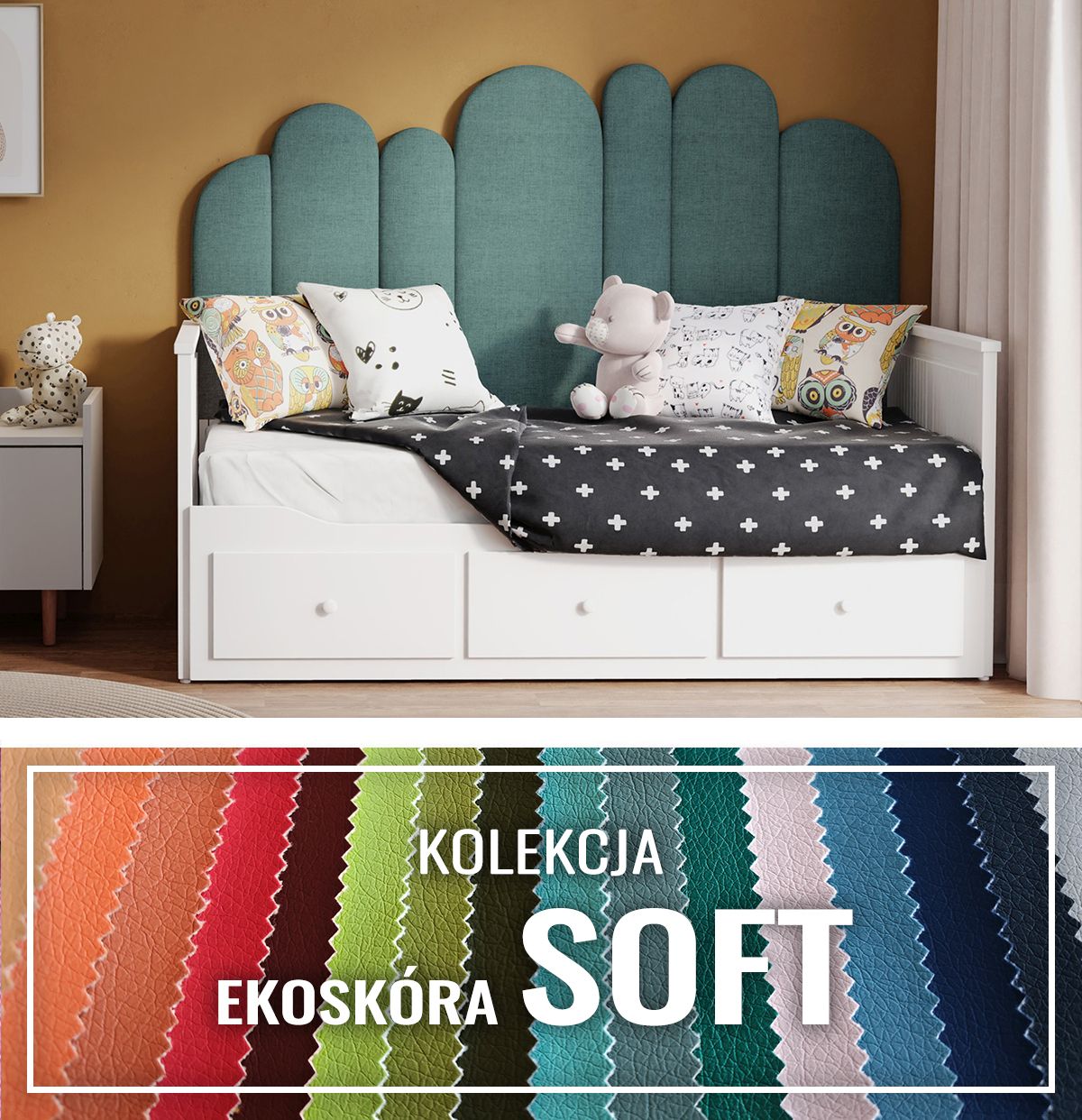 • Miękkie zagłowie łóżka, zapewniające komfort i wygodę.