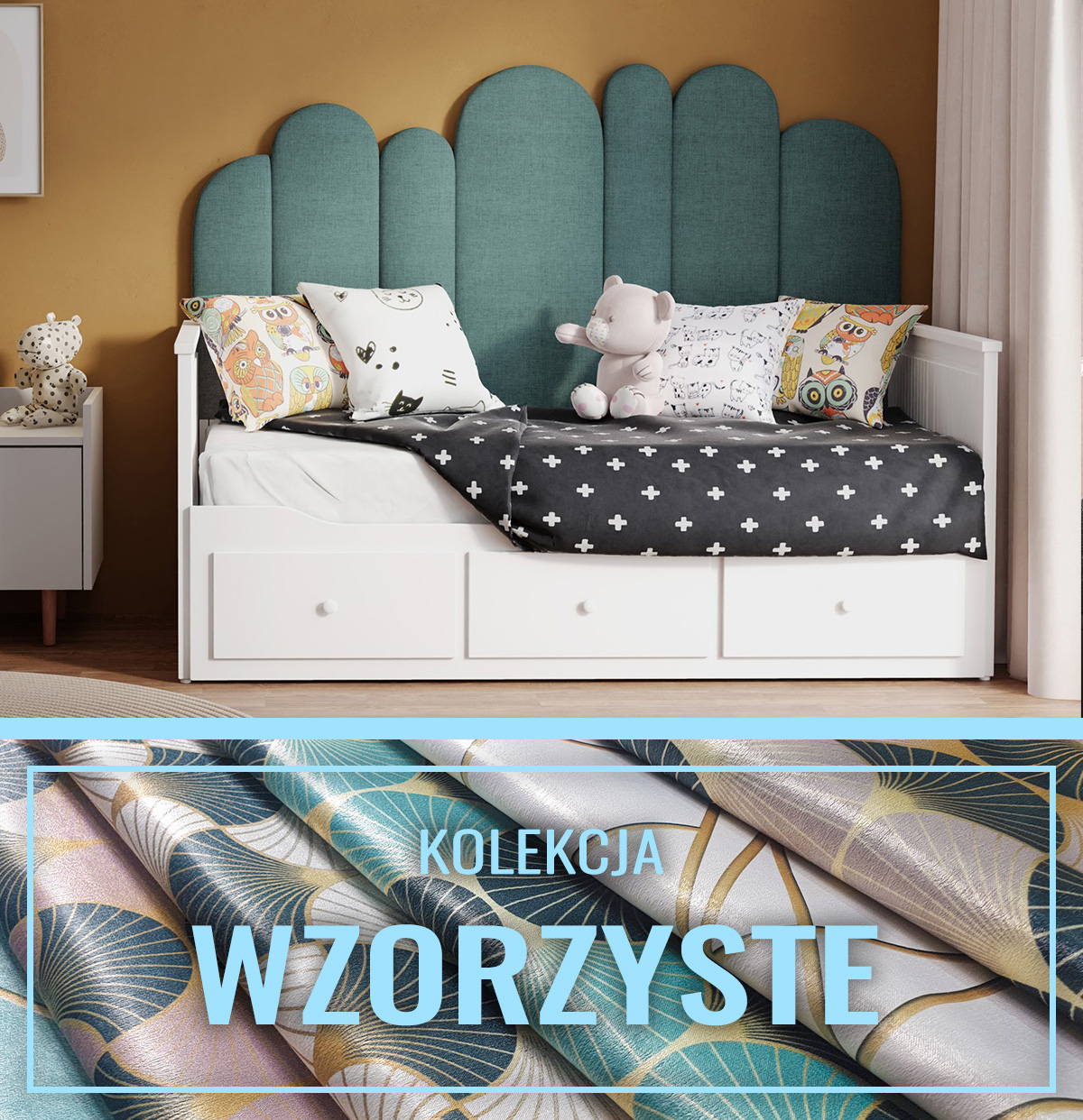 - Miękkie zagłowie łóżka, zapewniające komfort i wygodę.
