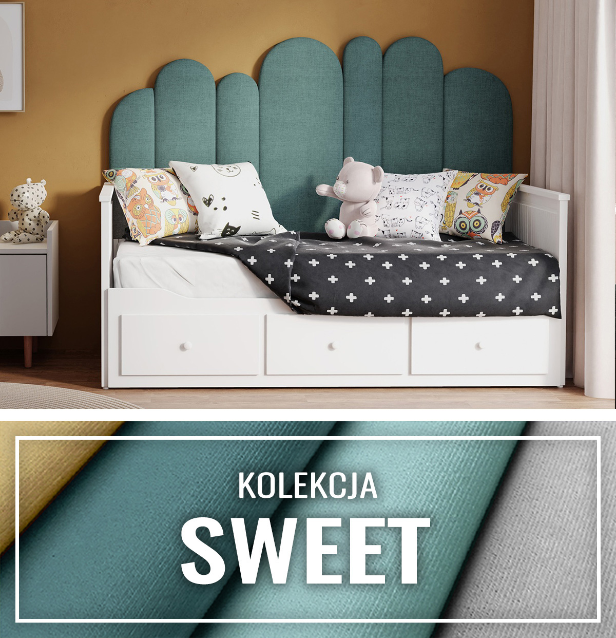 • Miękkie zagłowie łóżka, zapewniające komfort i wygodę.